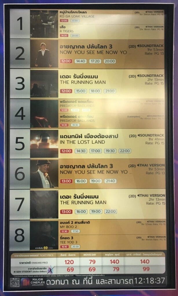 Pricing: Standard tickets range from 170 to 220 baht ($5.00 to $6.40 USD) for regular 2D screenings, with newer releases at the higher end of that range. Premium seating options can go up to 280 baht ($8.20 USD) or more for special formats and VIP experiences.